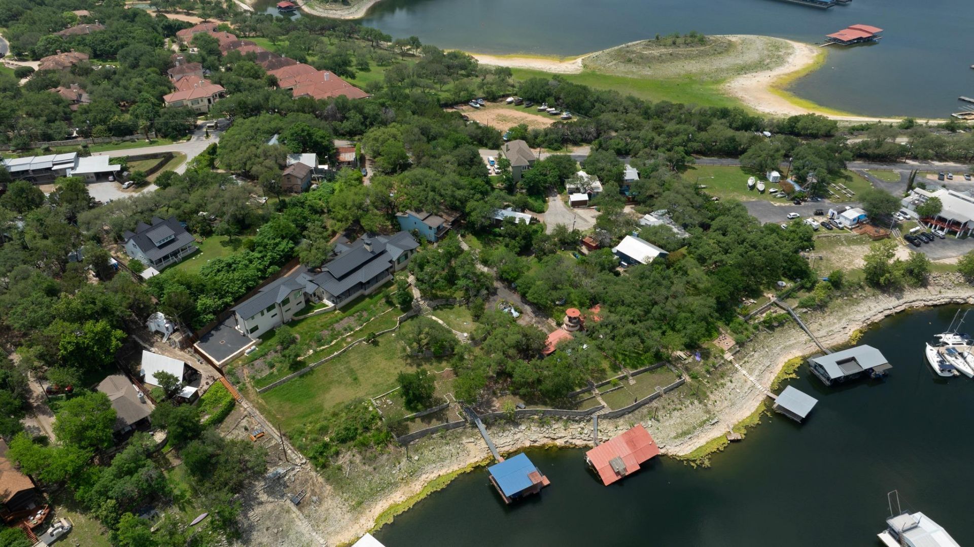 Set along a quiet private drive, this 1.15-acre property offers a rare opportunity to secure elevated Lake Travis waterfront in one of Lakeways most desirable pockets. With over 100 feet of shoreline and sweeping views across the cove, the setting delivers both privacy and long-term upside. Positioned above the waterline, the homesite provides a significant advantage for future construction. The elevation allows for new development without the need for stilts, creating a more efficient and flexible build process compared to many neighboring waterfront properties. The existing improvements include multiple structures, a grandfathered lakeside pavilion with indoor studio and half bath, and a two-slip boat dock with party deck. Mature trees, established stonework, and terraced paths lead down to the water, giving the property a sense of character and scale that is increasingly difficult to replicate. While the current home and structures offer potential for renovation, the highest and best use is likely redevelopment. This property reflects the growing emphasis on premier waterfront land, offering a generous footprint, usable topography, and exceptional positioning on the lake. Whether envisioned as a custom estate or a long-term investment, this is a standout opportunity to create something truly special on Lake Travis.