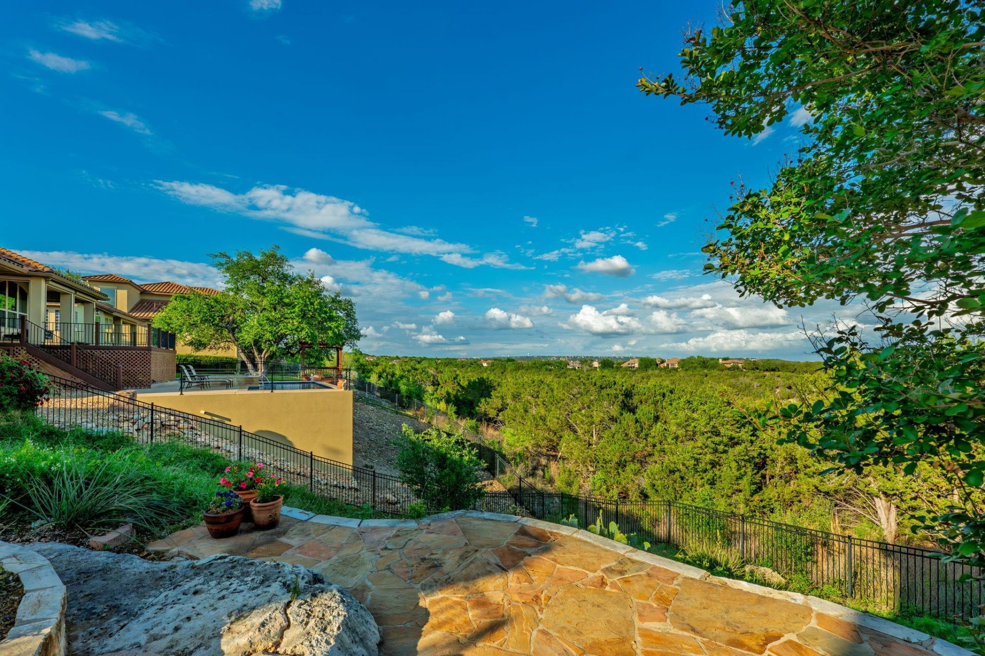 Tucked within the gated community of the University of Texas Golf Club in sought-after Steiner Ranch, this beautifully maintained 3-bedroom, 2-bath home with a private office offers comfort, style, and stunning Hill Country views. A dedicated office with double doors provides the perfect work-from-home setup. The expansive kitchen serves as the heart of the home, featuring stainless steel appliances, a gas stove, center island, abundant cabinetry, and generous counter space?all seamlessly overlooking the breakfast bar, dining area, and living room. Both the kitchen and dining spaces are enhanced with custom light fixtures that add a touch of elegance. The living room is warm and inviting with a beautiful fireplace, tray ceilings, crown molding, and built-in surround sound. Large windows frame breathtaking views of the backyard and the rolling Texas Hill Country beyond. The primary suite is a true retreat, complete with tray ceilings, crown molding, a bay window, plantation shutters, and those same incredible views. The ensuite bath offers a soaking tub, dual vanities, a separate shower, and a spacious walk-in closet. Two additional bedrooms and a full bath provide comfortable accommodations for family or guests. Custom tilework throughout the kitchen and bathrooms adds thoughtful detail and charm. Step outside to the true highlight of the home?an exceptional backyard with panoramic Hill Country views that stretch for miles. Enjoy the scenery from the spacious wooden deck, which leads down to a stone patio surrounded by beautifully designed landscaping. Residents of Steiner Ranch enjoy access to top-tier amenities, including pools, parks, trails, and lake access, making this community one of Austins most desirable places to call home.