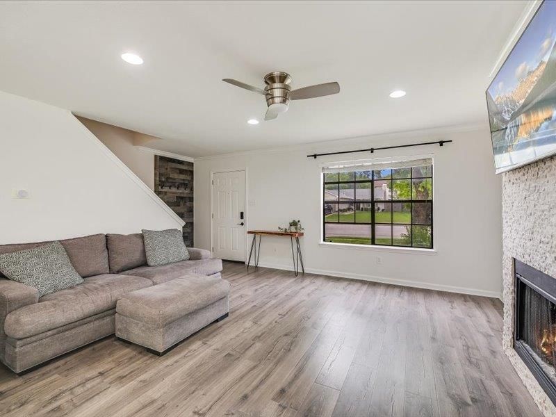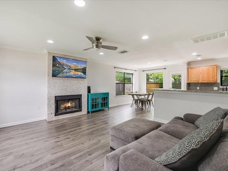 Beautiful two-story stone faade home located in the desirable Northtown Park community in Pflugerville. This well-maintained residence offers 3 bedrooms, 2.5 baths, and a versatile living layout designed for both comfort and functionality.The main living area features wood-look flooring, abundant natural light, and a cozy fireplace, creating an inviting space for relaxing or entertaining.The kitchen is equipped with stainless steel appliances, granite countertops, ample cabinetry, and a stylish tile backsplash, opening seamlessly to the dining area with views of the backyard.The spacious primary suite includes a vaulted ceiling, large windows, and an en-suite bath.Additional highlights include a secondary living or flex space, generously sized bedrooms, and a convenient in-garage laundry area. Step outside to a large, private backyard with mature trees and wood fencing, perfect for outdoor gatherings.Situated on an interior lot with a two-car garage and no HOA, this home offers easy access to major highways, shopping, dining, and local amenities. Zoned to Pflugerville ISD schools.