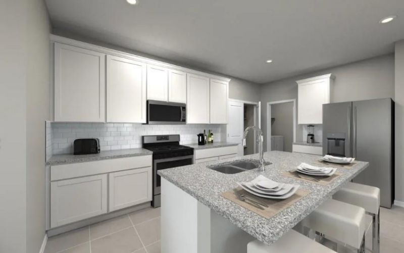 Brand New Energy Efficient Home Available May 2026. The Olympic features a second-story loft area that the kids will love. Gray cabinets with marble-look white quartz countertops, warm beige EVP flooring, and multi-tone taupe carpet in our Radiant package
