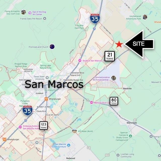 Vacant tract in the high-growth NE San Marcos corridor offering strong SH21 visibility and access. Proximity to San Marcos Regional Airport and surrounding development momentum supports commercial, light industrial, or mixed-use development potential. Survey on file. Water and Electricity available with no portion of the Property in the FEMA 100-year floodplain.