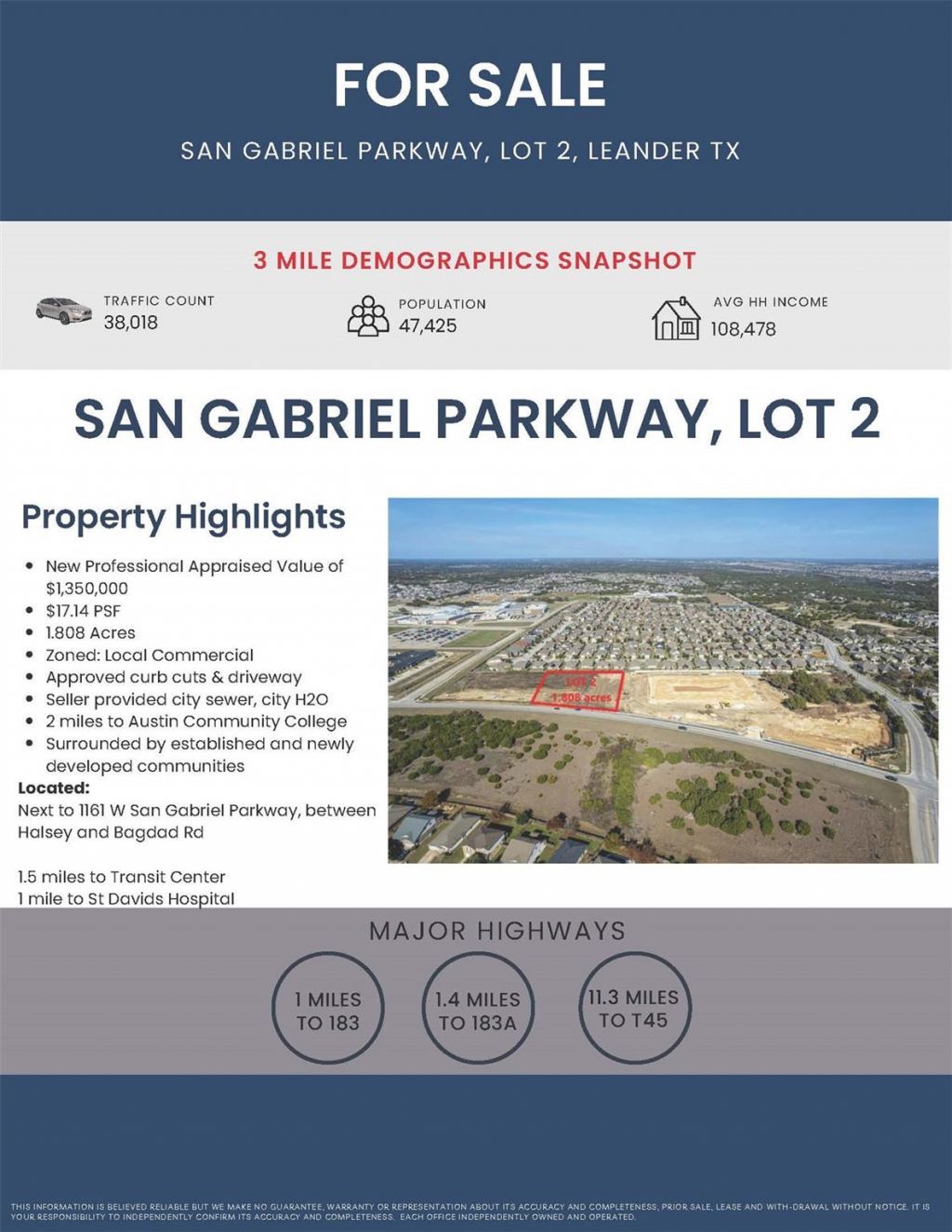 Shovel-Ready Commercial Site | Leander/Cedar Park CorridorTurnkey Development Opportunity in Texas Fastest-Growing SectorPosition your business at the center of the action on W. San Gabriel Parkway. This exceptional, cleared lot offers a turnkey opportunity for developers and investors to capitalize on the massive residential influx in the booming Leander/Cedar Park area.Location Highlights:The Heart of Growth: Surrounded by 12+ established and new residential communities, ensuring a high-density, immediate customer base.1 Mile to Northline: Minutes from Leanders 115-acre mixed-use Downtown District.1 Mile to St. Davids: High professional and employee traffic from the nearby medical complex.2 Miles to ACC San Gabriel: Capture the student and faculty demographic from the nearby campus.1.5 Miles to CapMetro: Excellent commuter connectivity to the greater Austin area.Site Advantages:Ready-to-Build: 100% flat, cleared lot with no trees, structures, or wells to mitigate.Utilities On-Site: Sewer, electric, and water at the lot line.Zoning & Approval: Zoned Local Commercial (LC) with full city plat approval in hand.Strategic Visibility: High-volume daily traffic from Tom Glenn High School, Arka Montessori, and the Hope Alliance Family Justice Center.Ideal Uses:Perfect for a neighborhood medical/dental clinic, small strip center, coffee shop, deli, or salon.Logistics:Address: Use 1161 W San Gabriel Pkwy for GPS. (North side of San Gabriel between Bagdad and Halsey).Access: Sign on property.Terms: Motivated seller seeking a quick close.Don't miss the chance to secure a footprint in one of the most explosive growth sectors in the state. Contact us today for details!